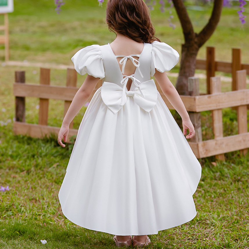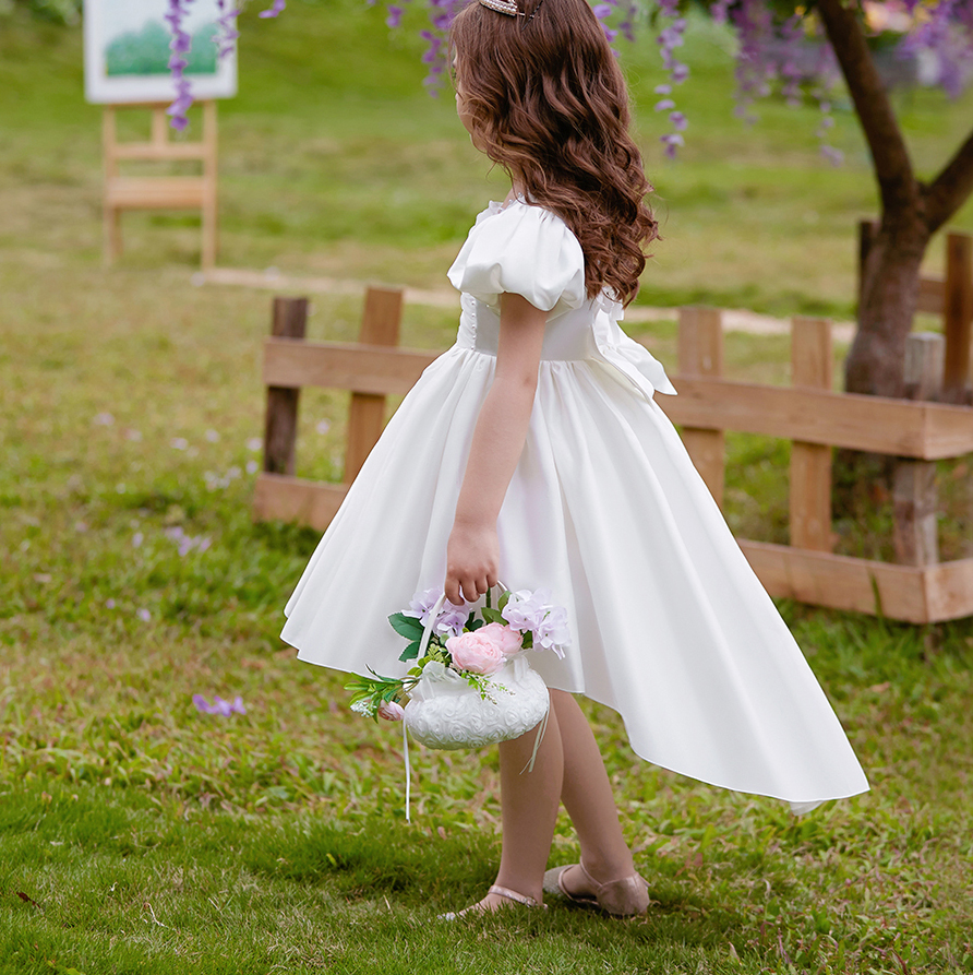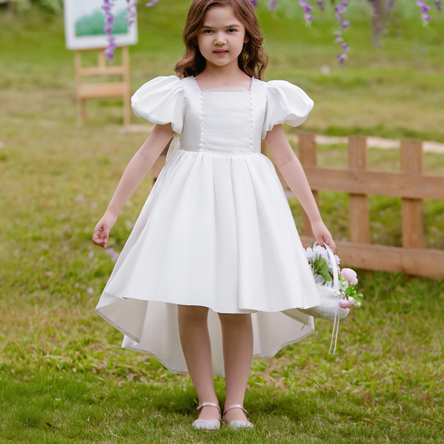O superba rochița eleganta pentru fetițe cu mânecuțe bufante, design scurt în fata și lung în spate, decolteu în V la spate și perlute în partea superioara.