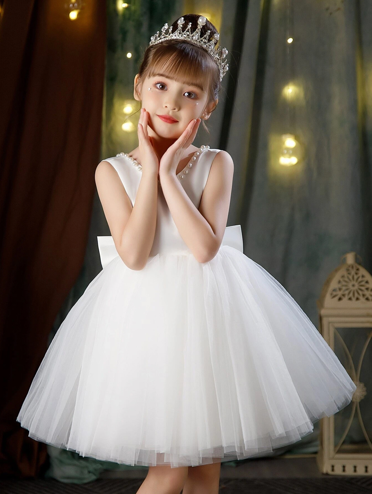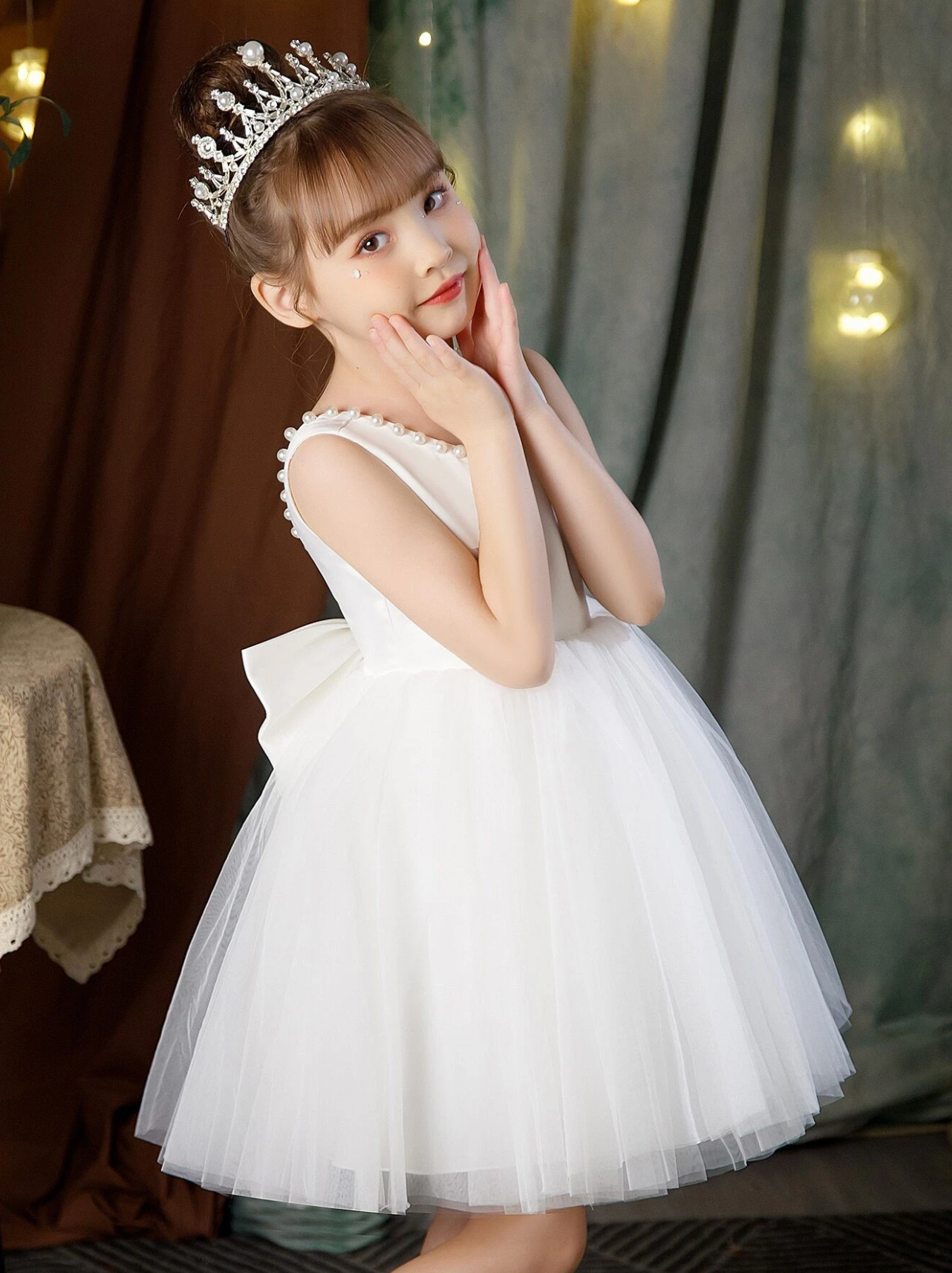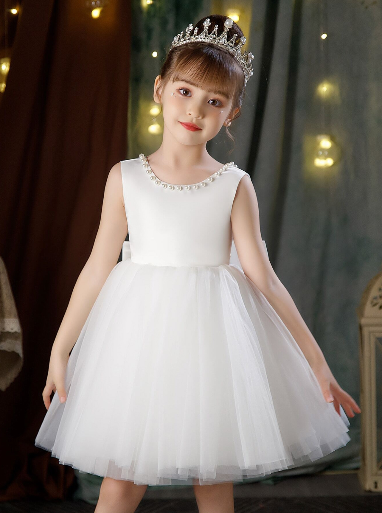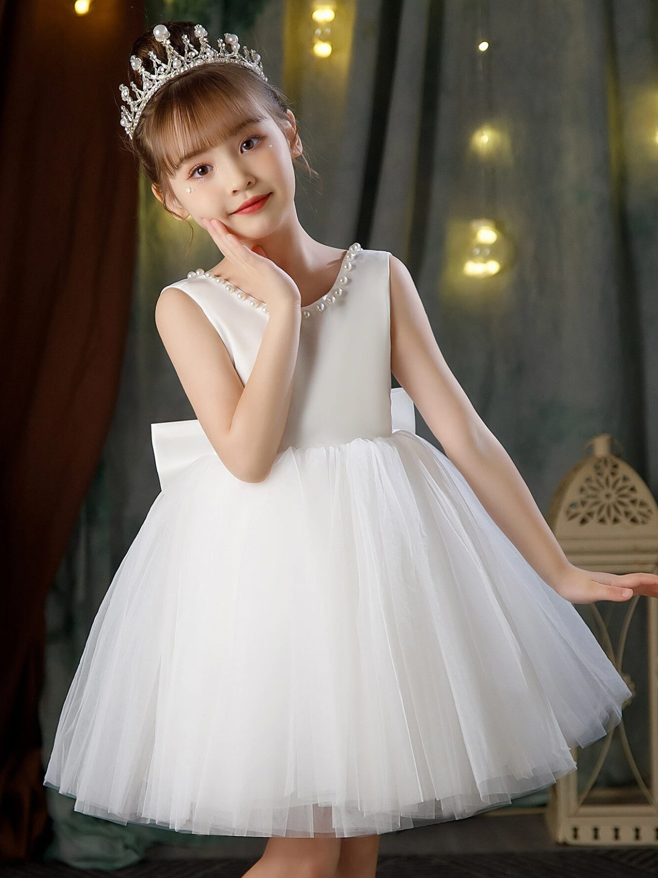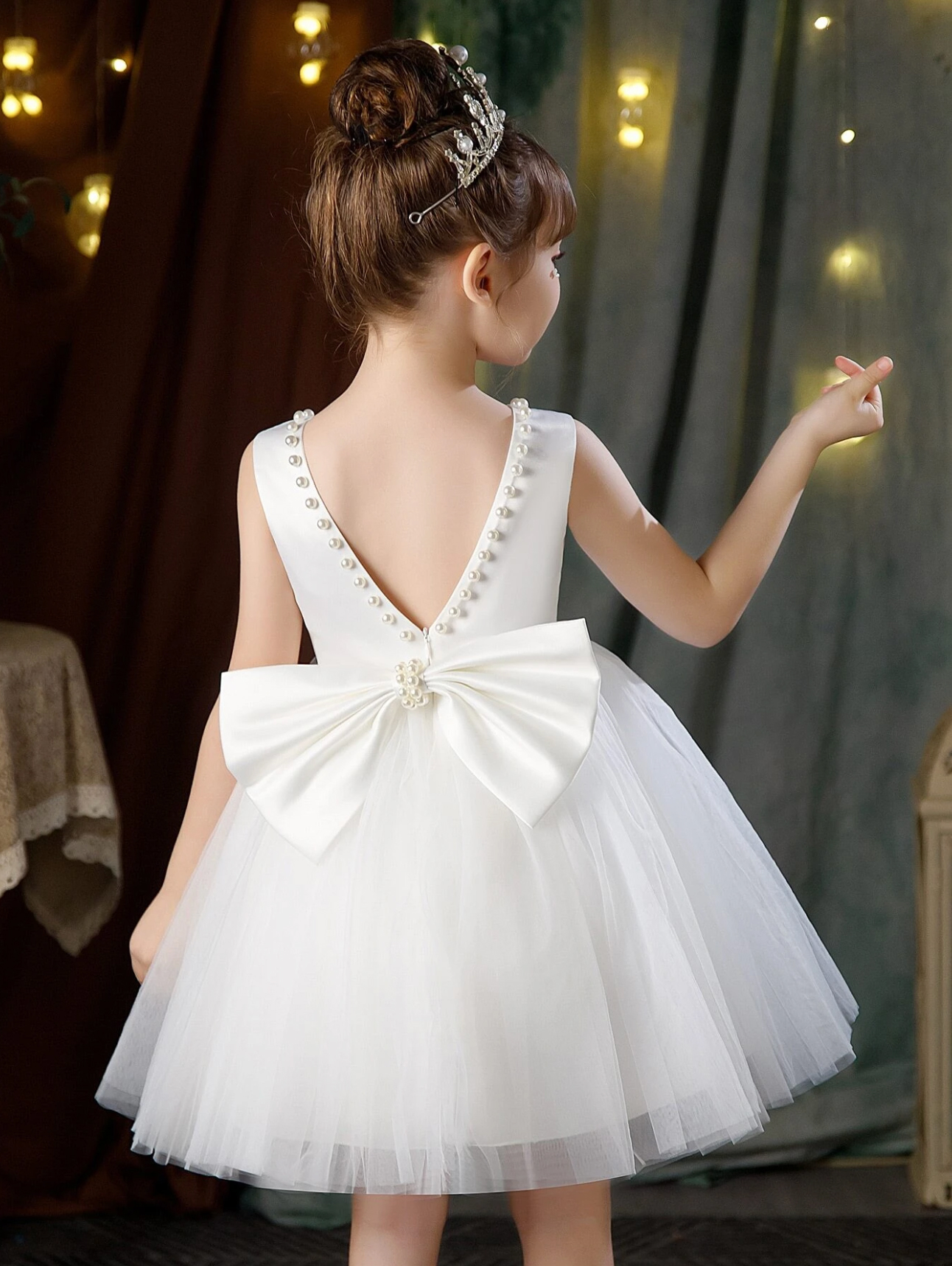 Rochita Maria este un model foarte delicat, accesorizat cu perlute pe margine si o fundita supradimensionata la spate detasabila.