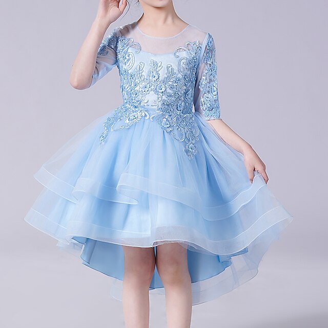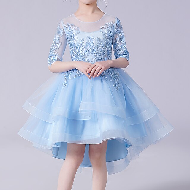Rochița eleganta pentru fete cu design scurt în fata și lunga în spate accesorizata cu broderie în partea superioara și pe mânecile trei sferturi având doua rânduri de tull cu intaritura pe margini.