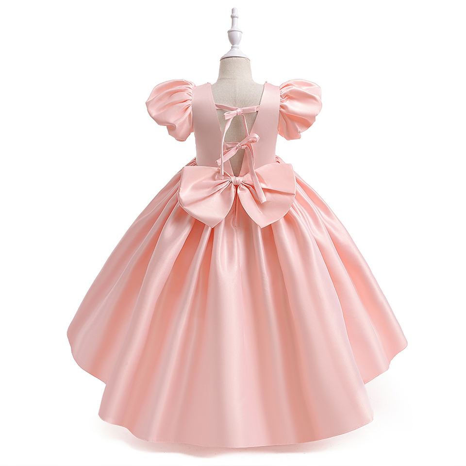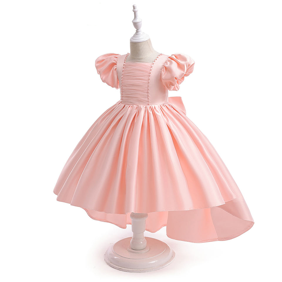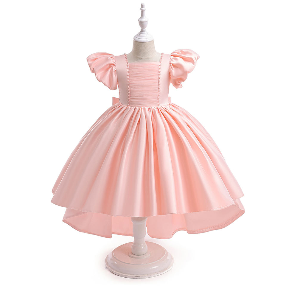 O superba rochița eleganta pentru fetițe cu mânecuțe bufante, design scurt în fata și lung în spate, decolteu în V la spate și perlute în partea superioara.