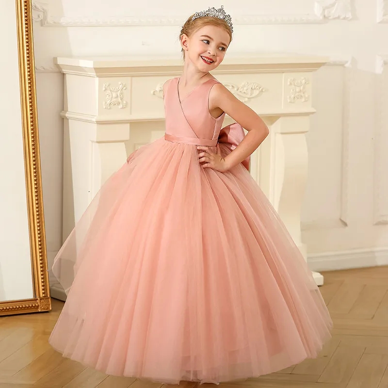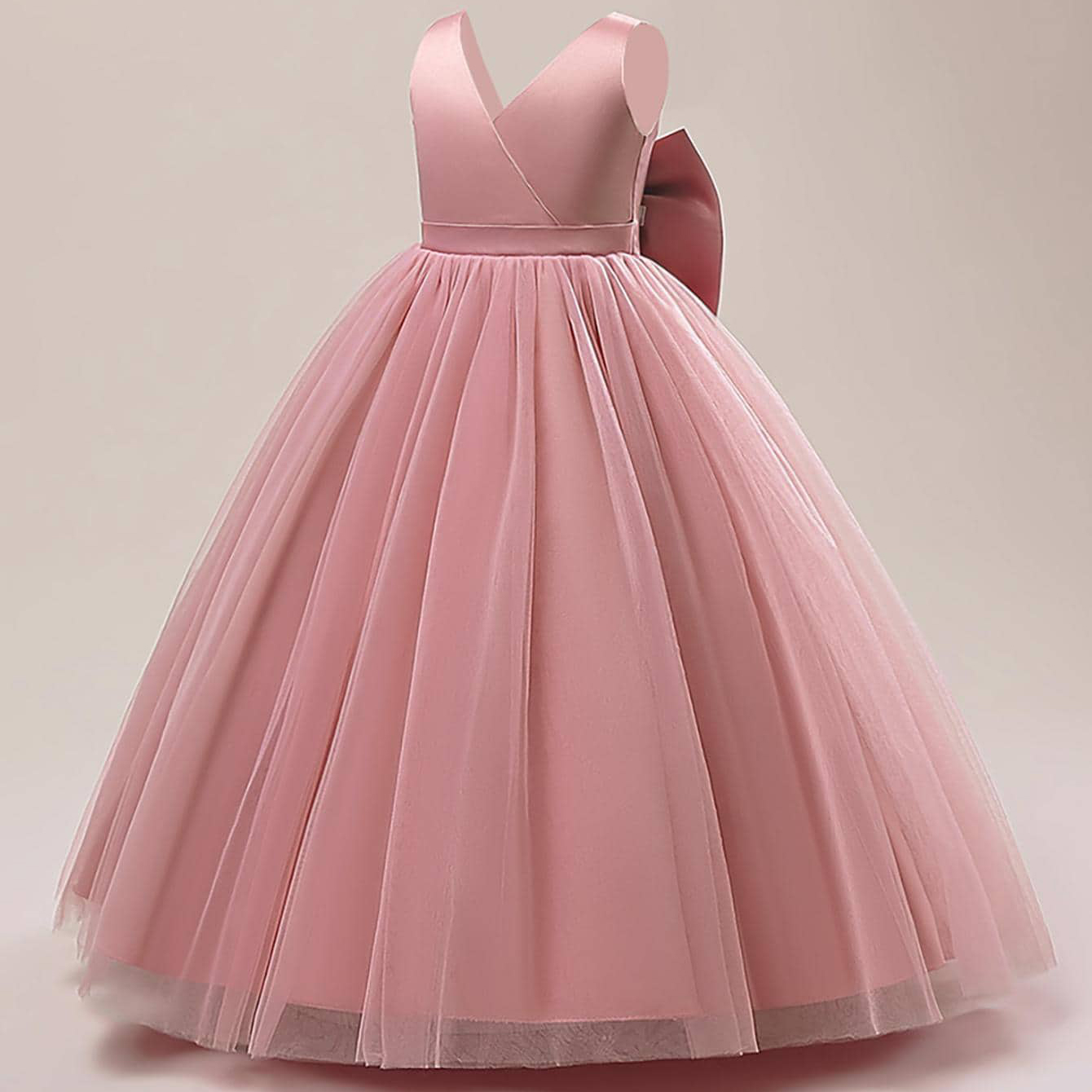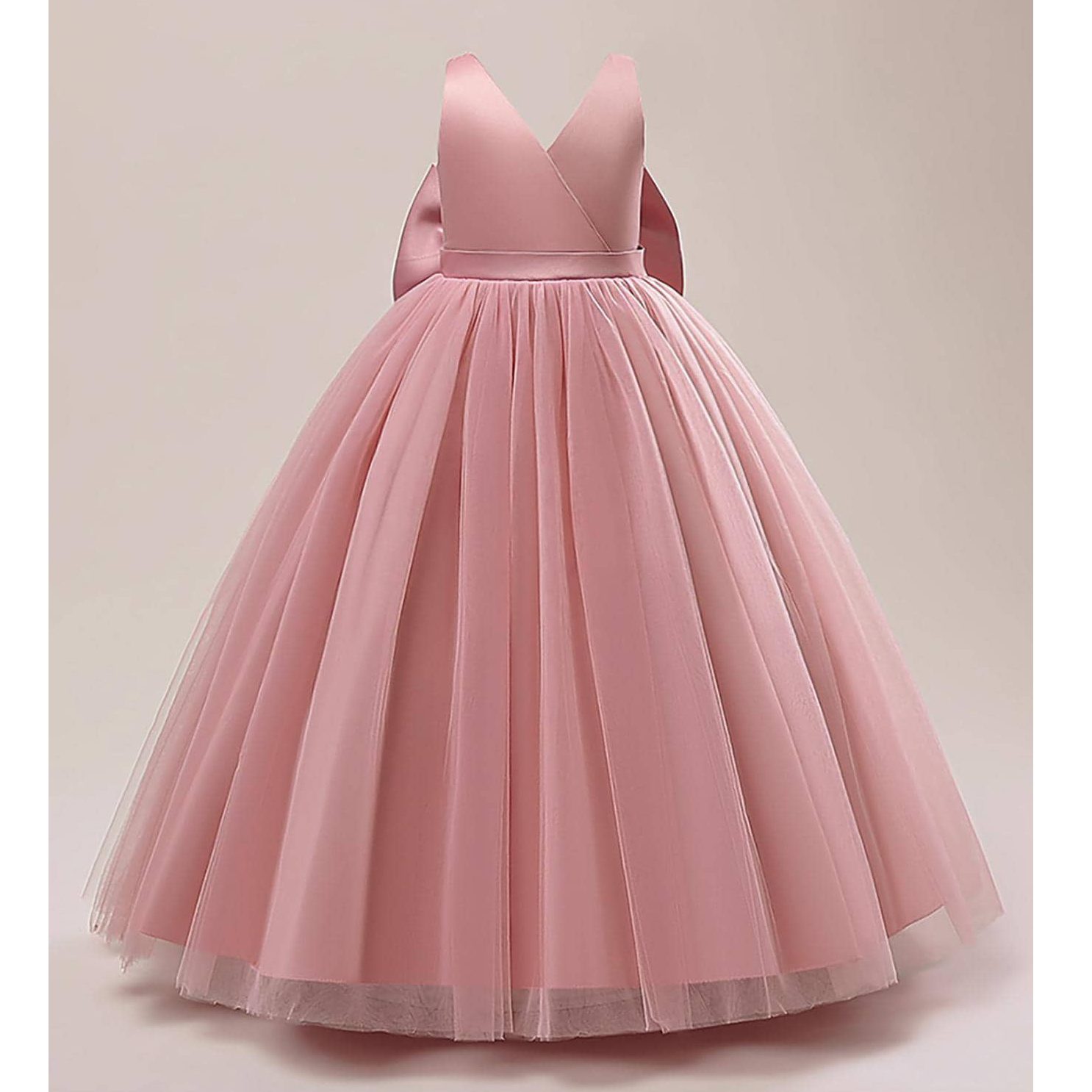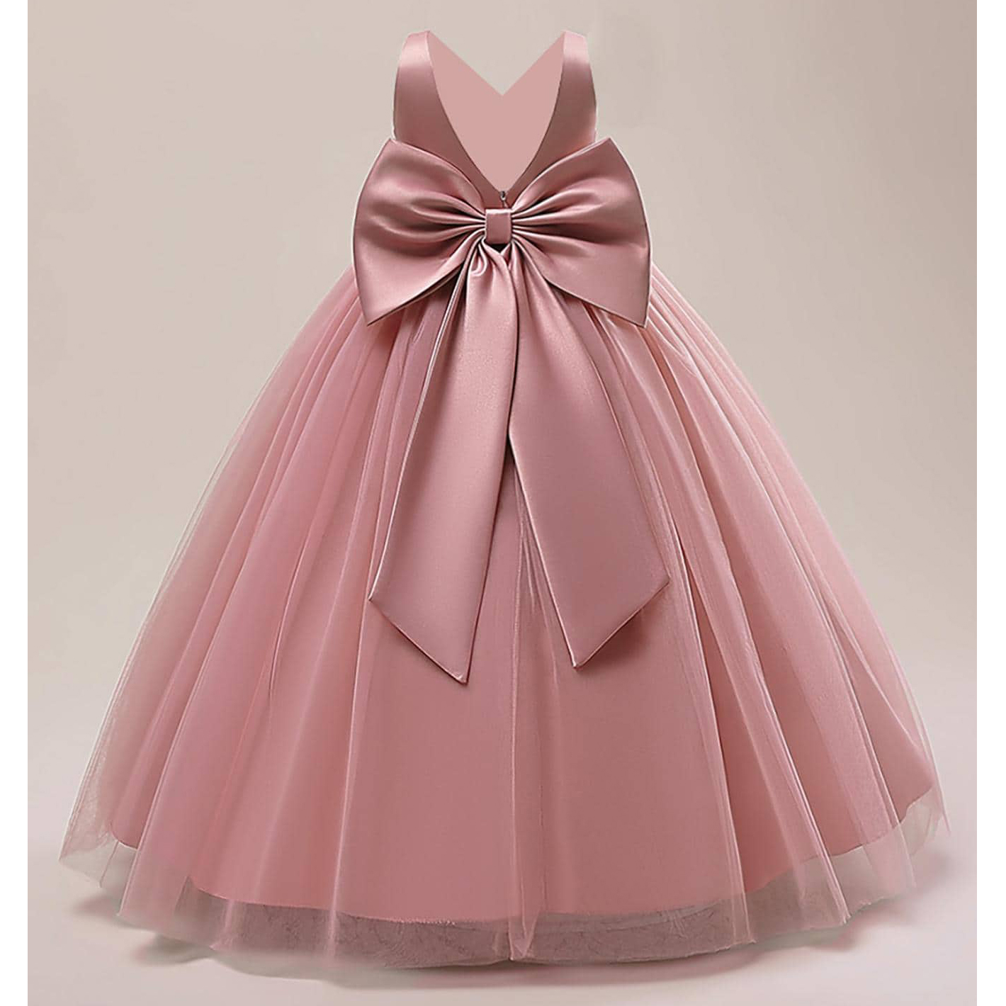 Rochița eleganta lunga culoarea roz pudra pentru fetițe cu design petrecut în partea superioara, spate ușor decupat în V și straturi de tull în partea inferioară.
