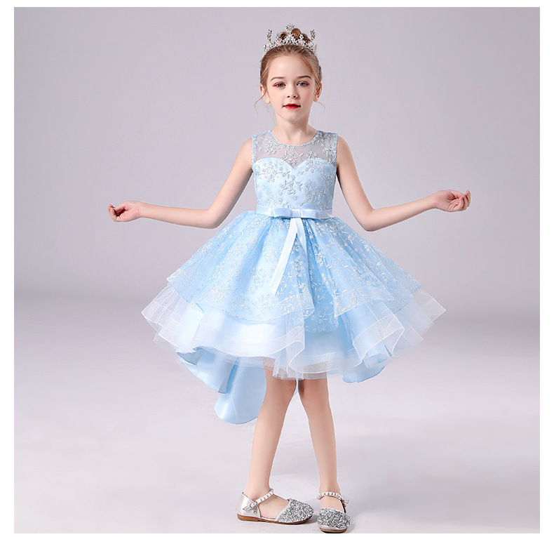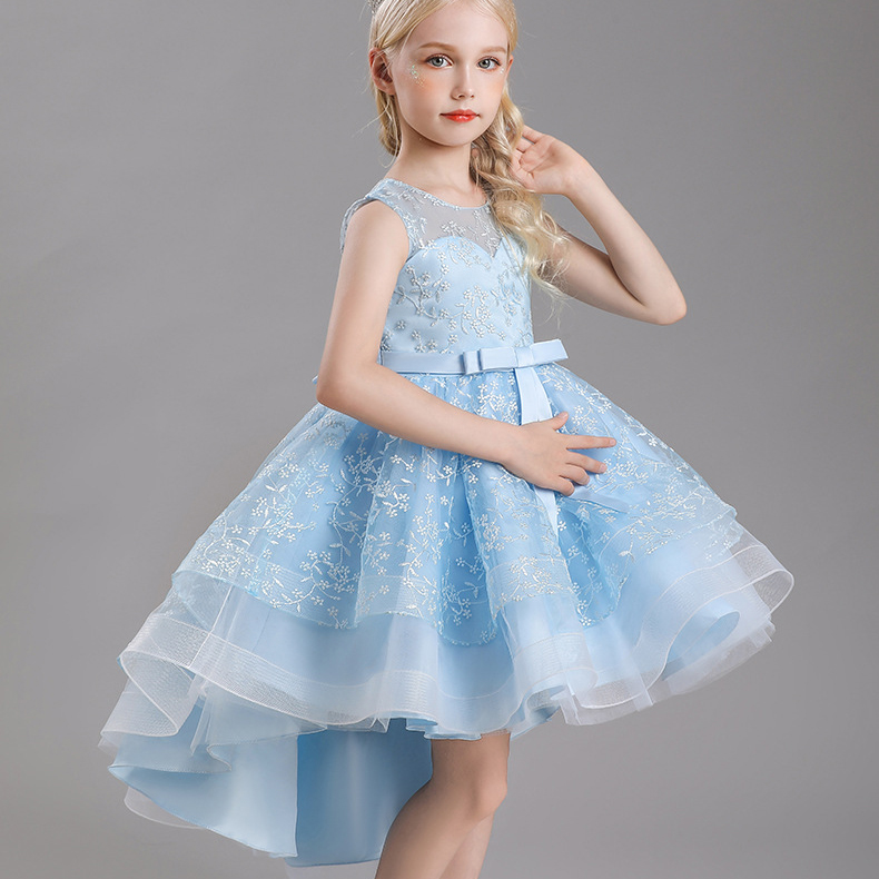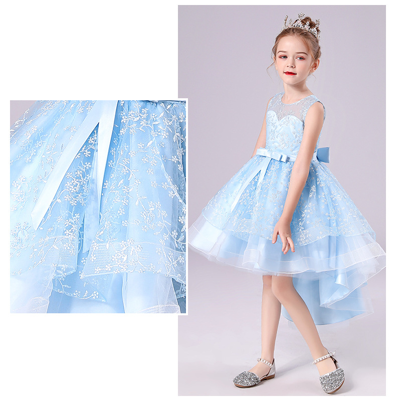 Rochita eleganta cu trena pentru fetita cu captuseala de bumbac si mai multe randuri de tull dintre care unul cu broderie florala.