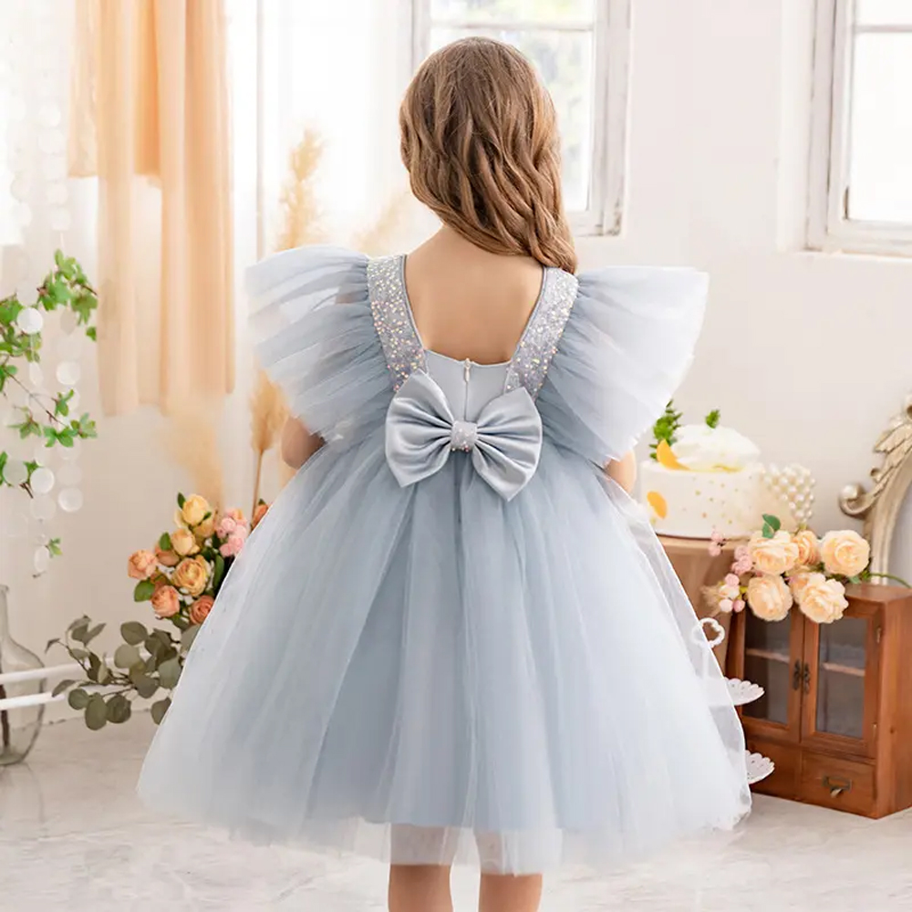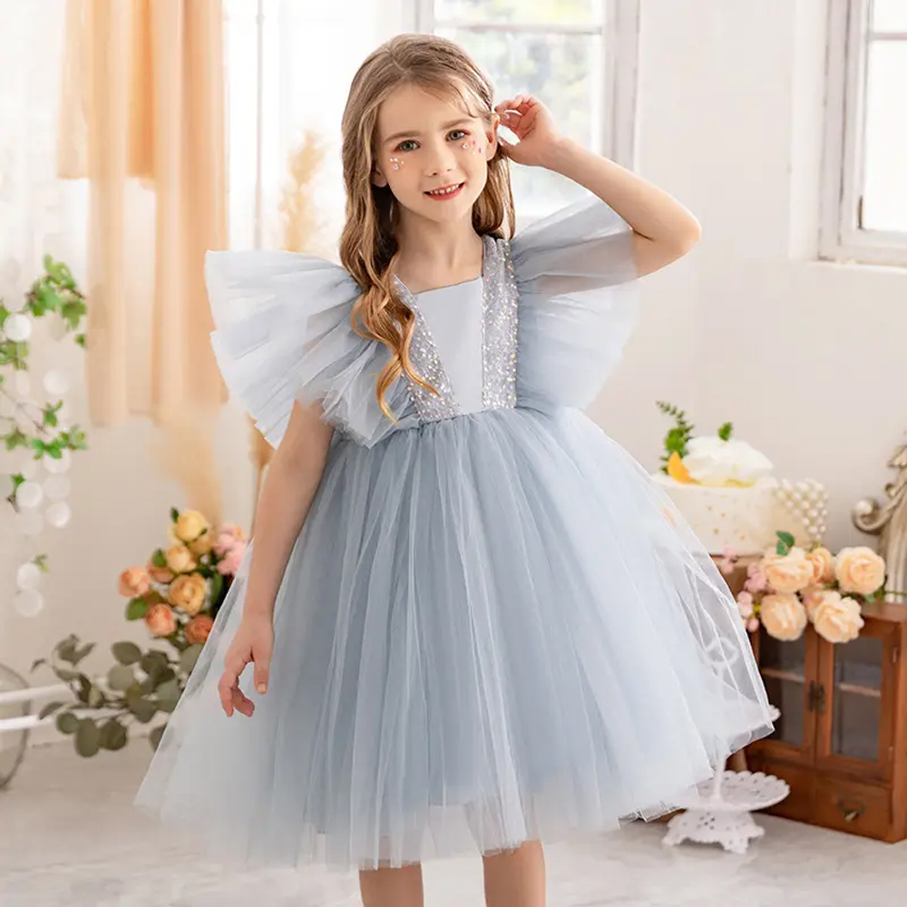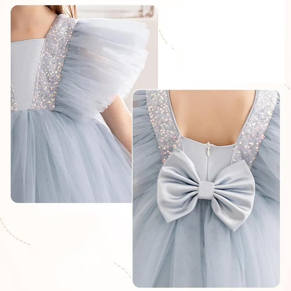 Rochita eleganta culoarea gri-bleu scurta pentru fetite cu straturi de tull in partea inferioara si cu design in V in partea superioara accesorizata cu paiete cusute.