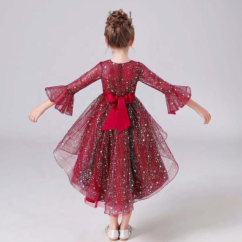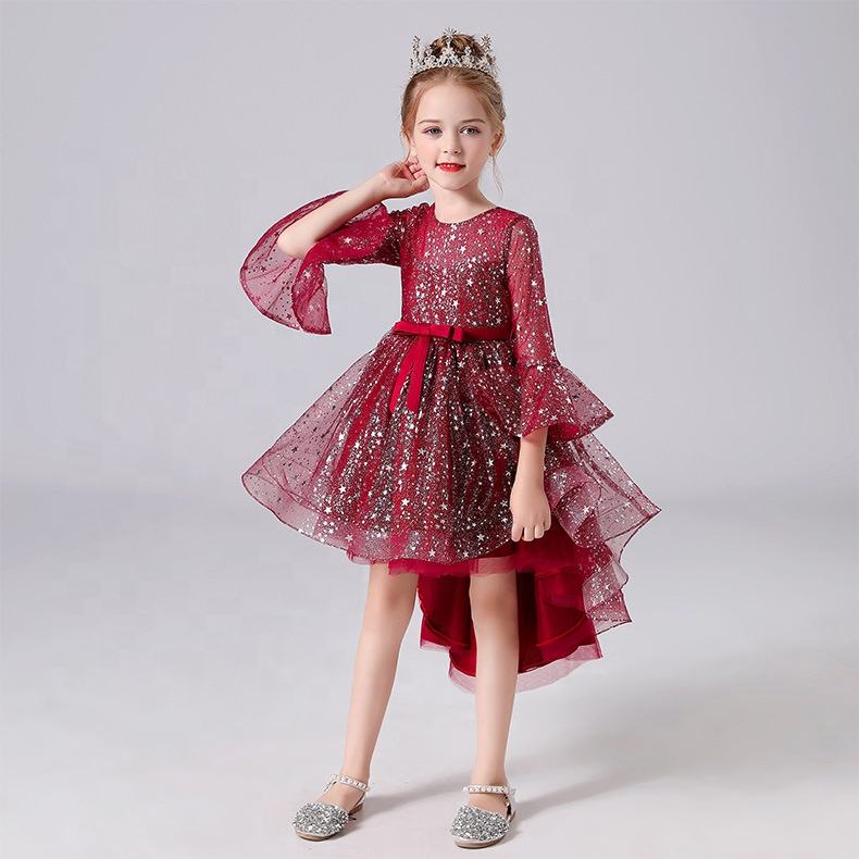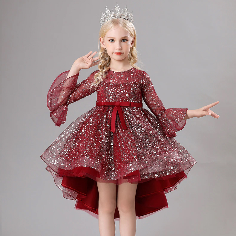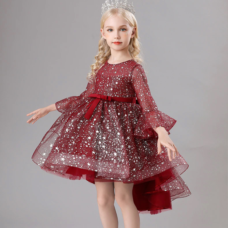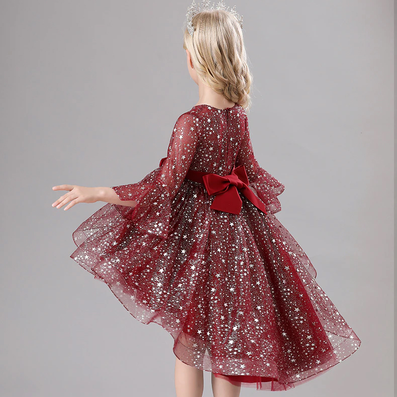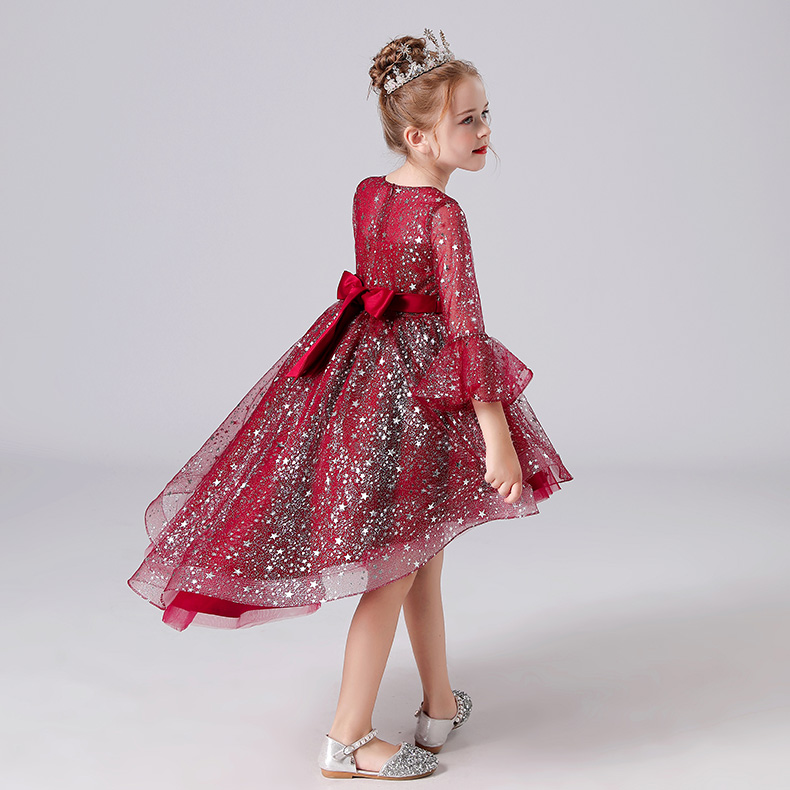 Rochita eleganta cu trena si manecute trei sferturi evazate pentru fetite.