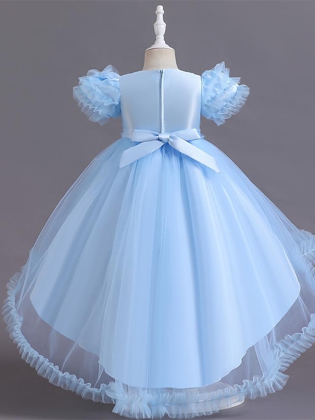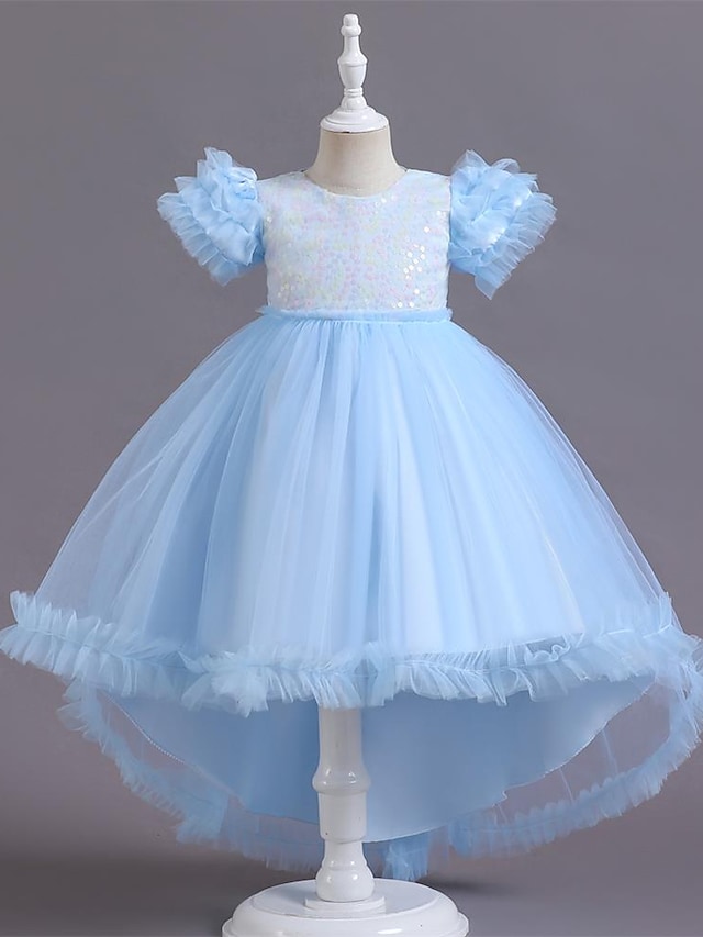 Catrinel este o rochita eleganta pentru fetite scurta in fata si lunga in spate cu maneci bufante acoperite cu tull si paiete multicolore in partea superioara.