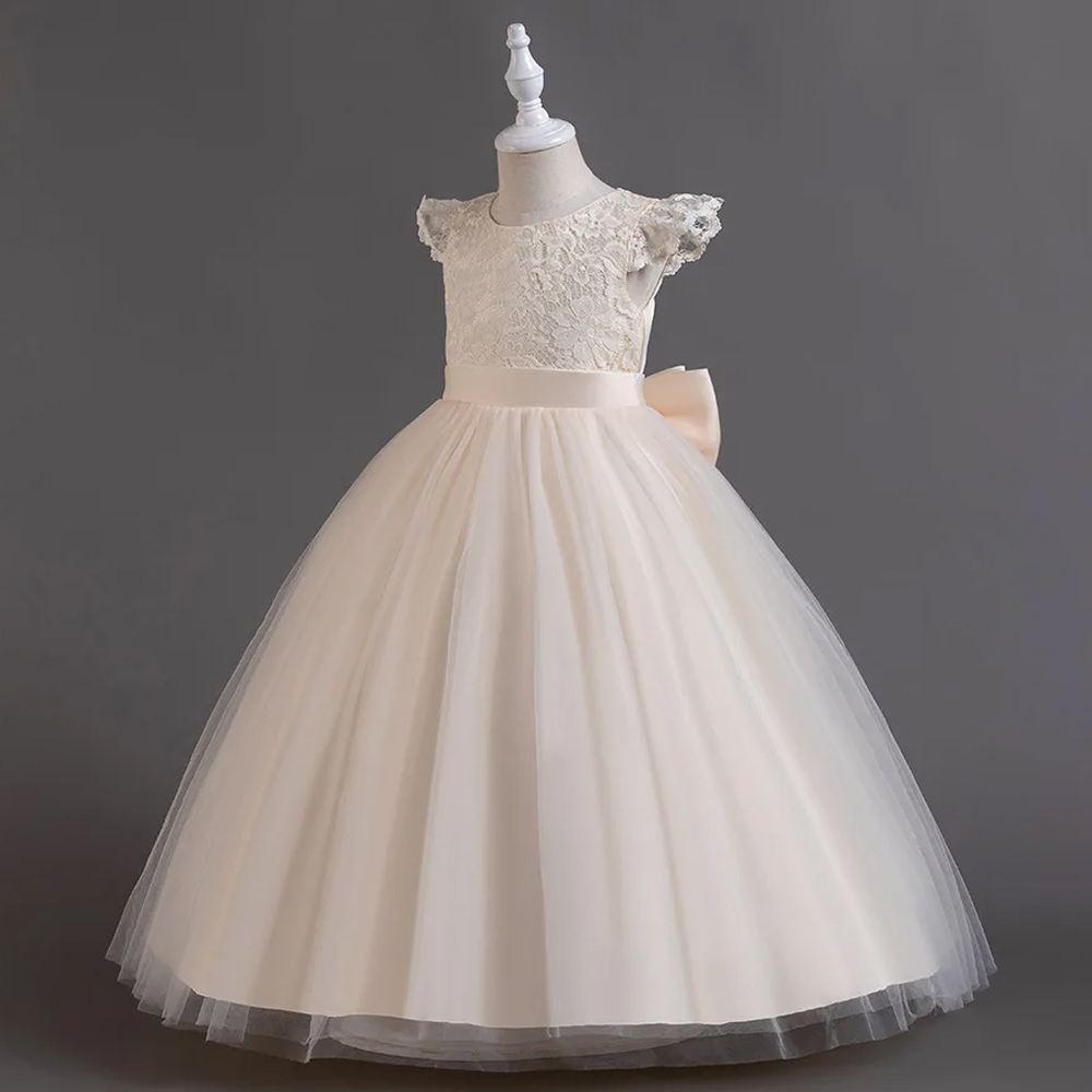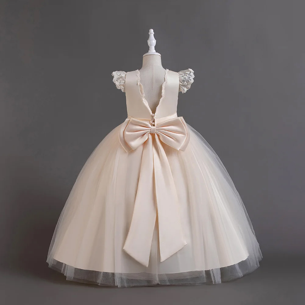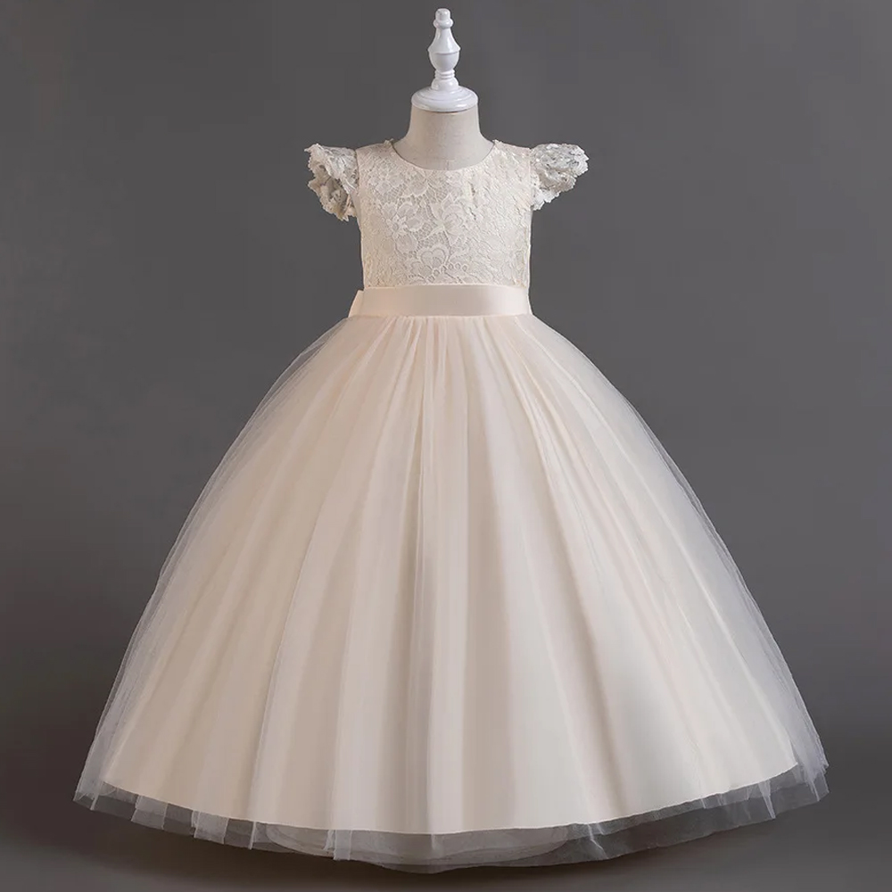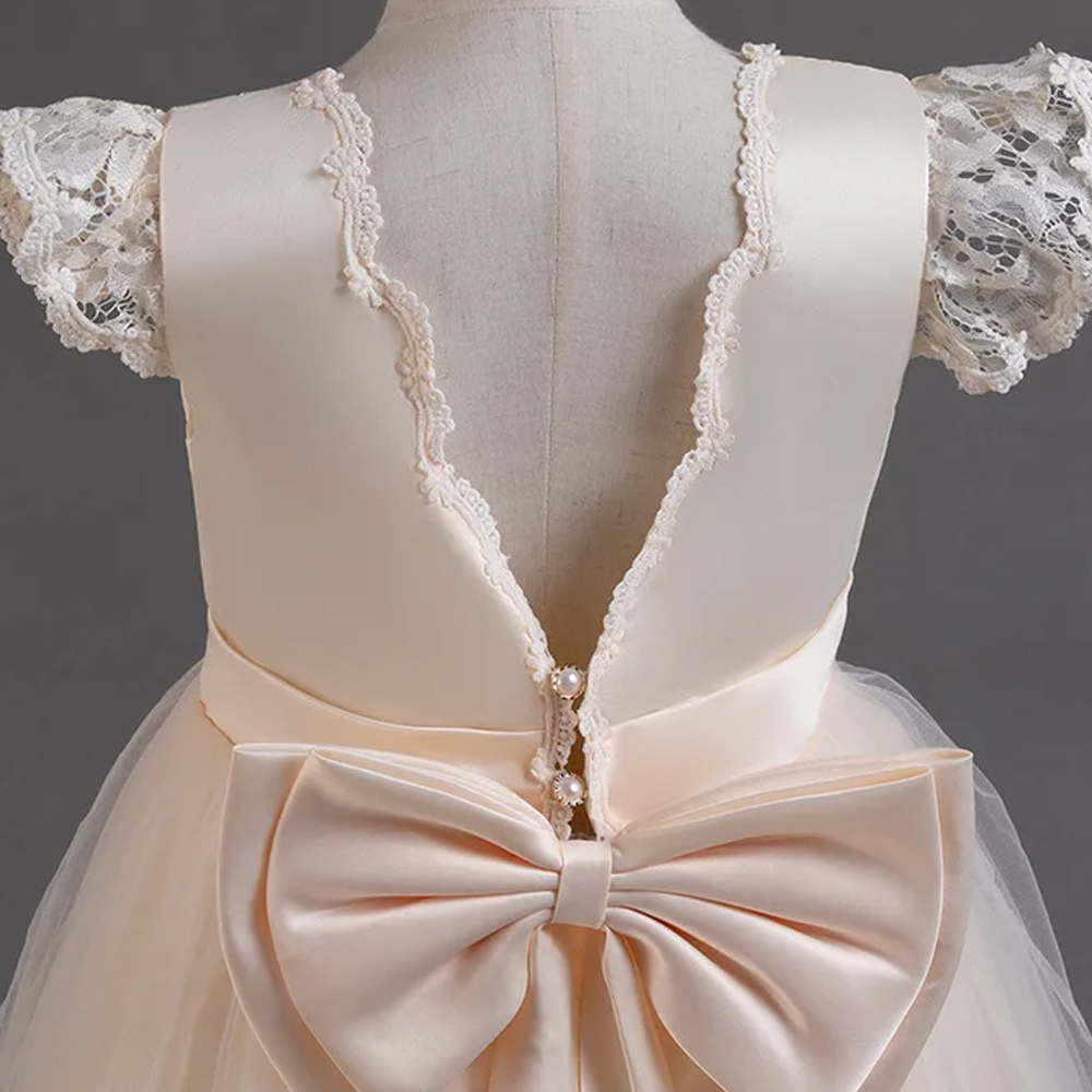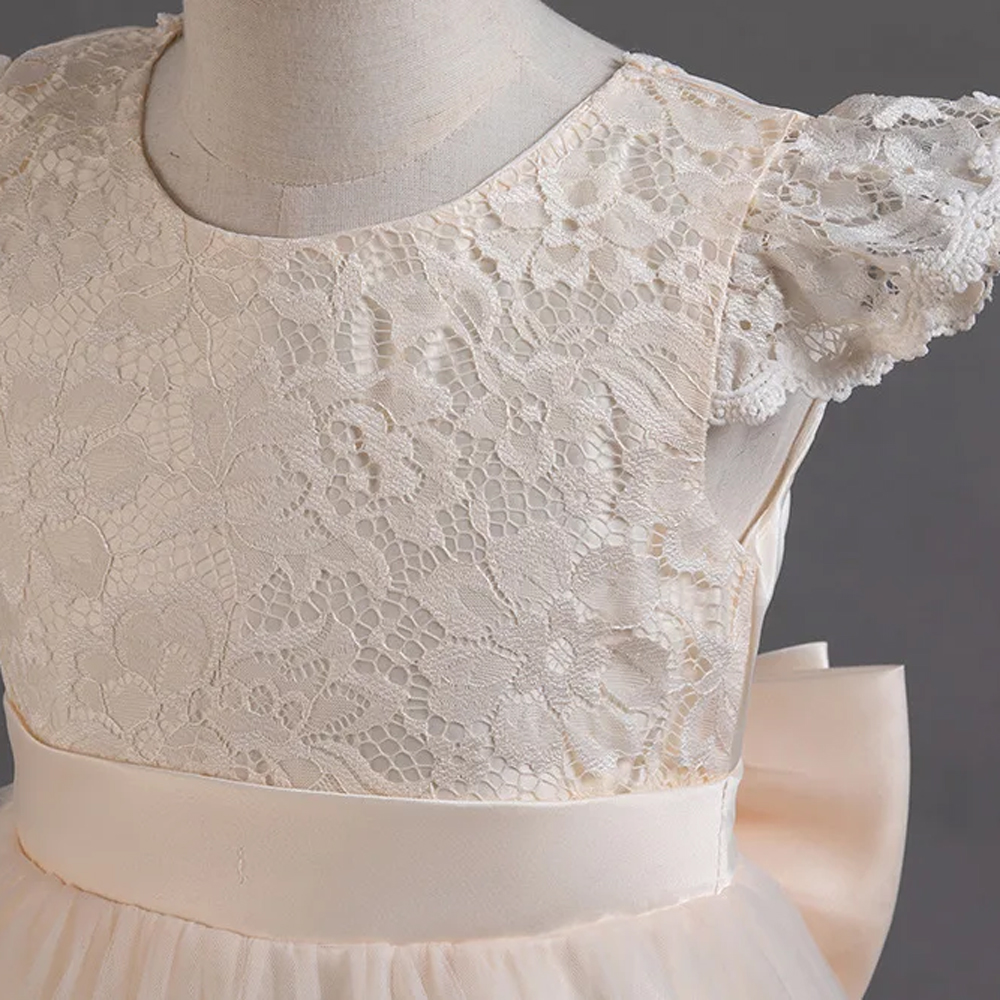 Rochita lunga pentru fete in nuanta nude-sampanie ce combina 3 tipuri de materiale intr-un mod simplist si elegant: dantela pe bust si manecile scurte, materialul satenat de la cordonul din talie ce se continua pe spate, in partea de jos si pe fundita detasabila, si desigur, tull-ul care ofera volum.