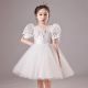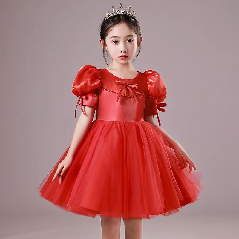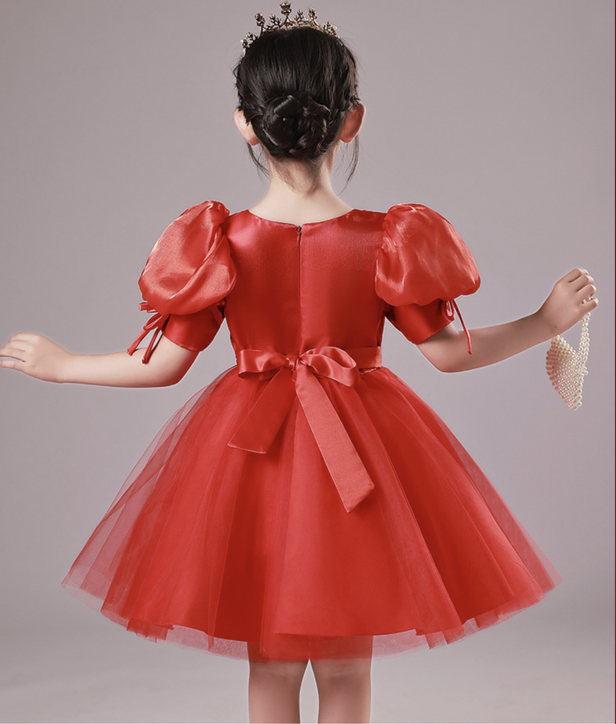 Rochita rosie scurta pentru fetite, ideala pentru nunti, botez si onomastica, cu perle, material satenat in partea superioara si fusta din straturi de tull.