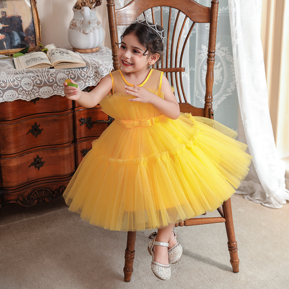 Rochita vesela pentru fetite culoarea galbena cu starturi multiple de tull si accesorizata cu fundita in partea din fata.